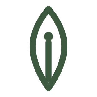 The mark is a single-line pen nib — the shape of putting something in writing. Drawn in deep sage, never in any other colour. Always with the dot.
